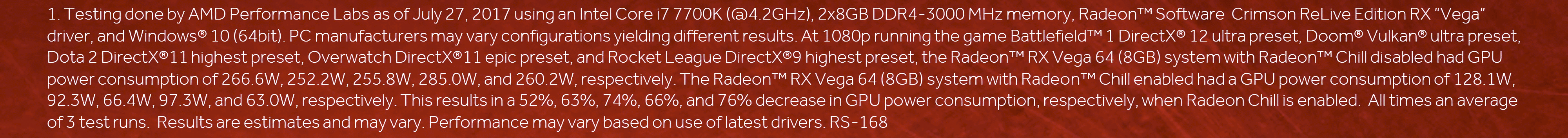 TDP (či TBP) poloprofesionálního Radeonu Vega Frontier Edition je nastaveno na 300 W pro vzduchem chlazenou verzi a 375 W pro vodou chlazenou verzi. Herní Radeon RX Vega 64 nabídne trochu přívětivější hodnoty - 295 wattů pro vzduchem chlazenou verzi a 345 wattů pro vodní. Přesto jde oproti předchozí generaci high-endu (Radeon R9 Fury) o poměrně vysoké hodnoty.