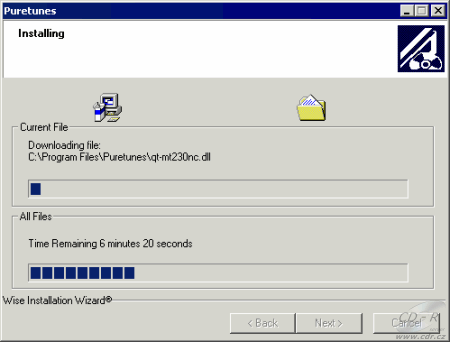Tady bylo další překvapení. Nějak se mi nelíbil údaj o tom, že instalace bude trvat déle jak 6 minut. Vždyť jsem si přece stáhnul jen 149kB soubor! No jasně, je to jako s IE. Instalace si z Internetu dotáhne další 56MB! Buďto jsem se špatně díval, nebo o této dost důležité věci nikde neinformují. Když instalace zkončí, spustí se PureTunes Downloader (tak se jmenuje).