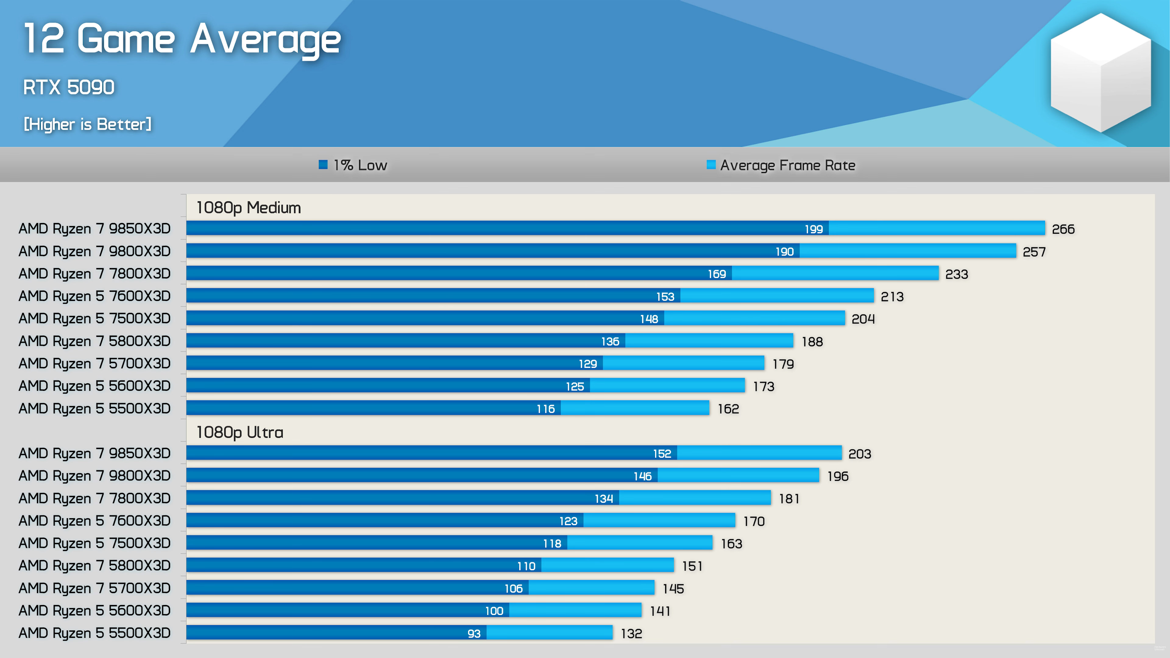 Průměrný herní výkon Ryzen X3D na GeForce RTX 5090 ve 12 hrách (Hardware Unboxed)
