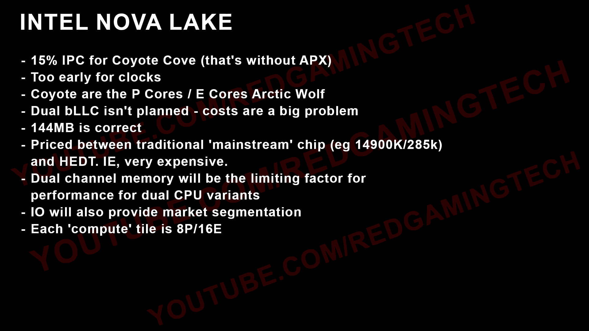 Novinkou je IPC velkých jader Coyote Cove, které by mělo stoupnout zhruba o 15 %. Problém je, že nebylo řečeno, oproti kterým velkým jádrům se IPC o těchto 15 % posune. Možnosti jsou tři - oproti Arrow Lake, oproti Arrow Lake-refresh (který bude mít díky doladěným latencím a vyšší datové propustnosti o nějaké procento vyšší IPC) nebo oproti Panther Lake (který má být do 10% nad Arrow Lake).