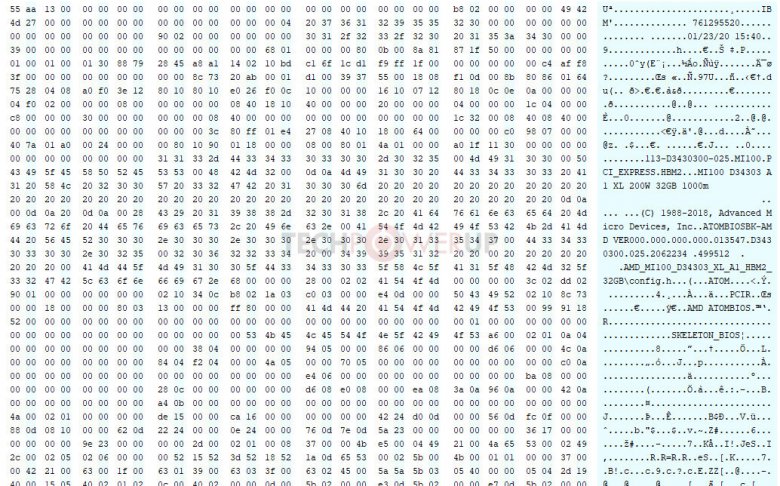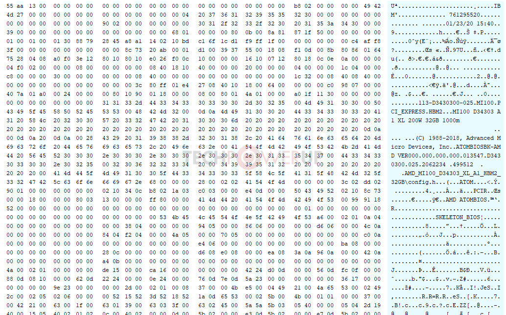 Řetězec „MI100 D34303 A1 XL 200W 32GB 1000m“ nám pak sděluje, že karta ponese označení Radeon Instinct MI100, bude mít nastavené 200W TDP a osazeno bude již zmíněných 32 GB paměti.