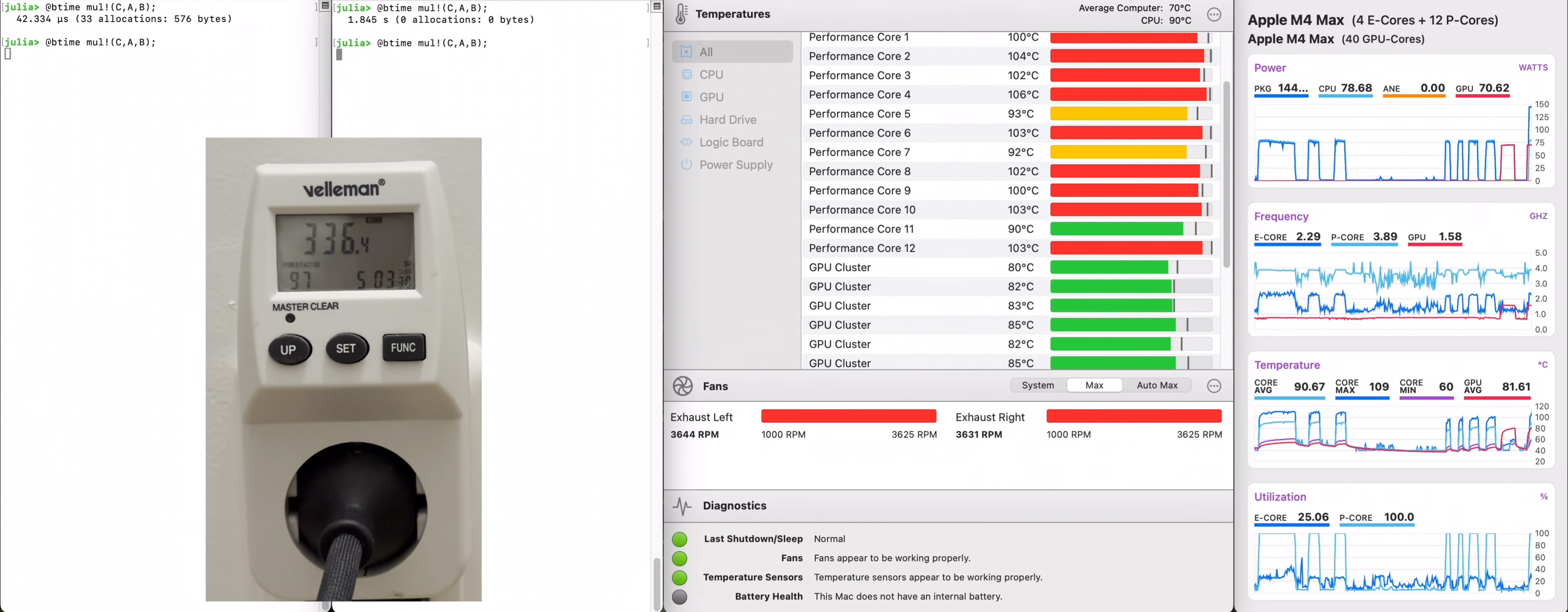 Zatímco aplikace využívající rozhraní powermetrics (tedy všechny aplikace v praxi využívané k „měření“ spotřeby ukazují často hodnoty ve vyšších desítkách wattů, výjimečně kolem 200 wattů, jak zveřejnil MarionberryDear6170, při reálném měření spotřeby se lze dostat k násobně odlišným hodnotám. V zátěži CPU + GPU na M4 Max, kde „měření“ přes powermetrics zobrazuje 144 wattů, ukazuje wattmetr na zásuvce ~336 wattů: