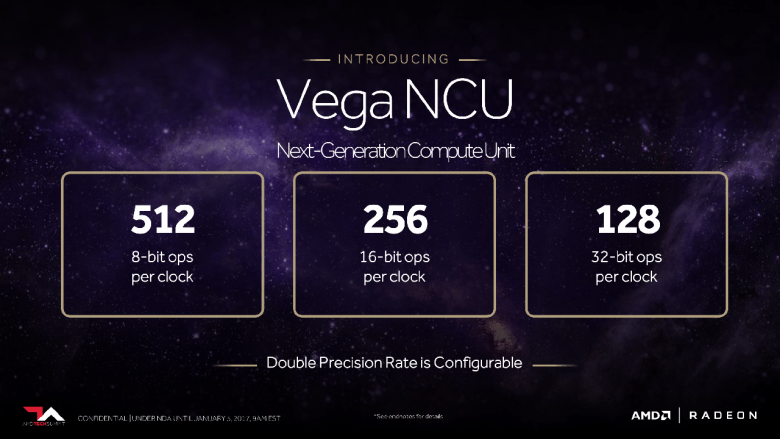 Začněme u výpočetních bloků. S jistotou můžeme říct, že architektura krom standardní přesnosti FP32 (single-precision) podporuje nativně FP16 (half-precision) a to při dvojnásobné rychlosti oproti FP32 a dále podporuje nativně Int8 a to při čtyřnásobné rychlosti oproti FP32. Bylo potvrzeno, že podporuje i FP64 (double-precision) s tím, že rychlost je konfigurovatelná. Můžeme předpokládat, že profesionální varianta Vega nabídne poloviční výkon oproti FP32 (pozn.: model s podporou FP64:FP32 v poměru 1:2 bude podle některých zdrojů vydán v roce 2018) a desktopová varianta bude softwarově omezena. Jde tedy o první (známou) grafickou architekturu, která nativně a s vysokou rychlostí podporuje všechny čtyři formáty.