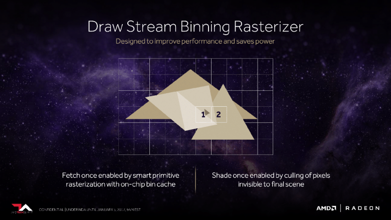 Významnou změnu podstoupil rasterizér. To je téma, které se - oproti rychlé podpoře formátů Int8 a FP16 v unifikovaném jádře - týká právě hráčů. AMD nazývá nový koncept Draw Stream Binning Rasterizer a jeho princip spočívá v rasterizaci po malých úsecích obrazu, které je možné zpracovat s využitím cache na úrovni čipu, čímž dojde k omezení nároků na paměťovou sběrnici a ke snížení energetických nároků. Jde v podstatě o odpověď na tile-based rasterizér Nvidie (Maxwell, Pascal), ale vzhledem k tomu, že ani o jedné technologii nebyly zveřejněny detailní informace, není přímé srovnání možné. Lze předpokládat, že drtivá část nárůstu herní efektivity architektury Vega oproti Polaris bude pocházet právě z této technologie.