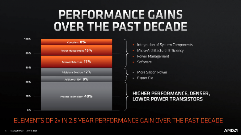 Další graf sumíruje, jakými prvky byl v minulé dekádě mezigeneračně posouván výkon produktů. V průměru šlo 40 % na výrobní proces (více tranzistorů, vyšší takty), 17 % na architekturu, 15 % na řízení spotřeby, 12 % na zvyšování plochy čipů, 8 % na zvyšování TDP a rovněž 8 % na kompilátory. Z tohoto sumáře je znát, že prakticky polovině zdrojů vyššího výkonu dochází dech a posuny výkonu budou tudíž v budoucnu nižší a nižší - nebo prodlevy mezi generacemi delší a delší. Nebo bude muset do hry vstoupit nová proměnná. Což je v současné době ve světě procesorů modularita - čiplety.