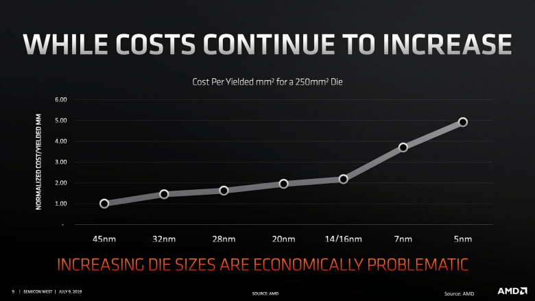 Nnaznačují totiž, jakým směrem se bude vývoj společnosti ubírat. Níže znázorněný graf ukazuje cenu za vytěžený (tzn. upotřebitelný) mm² z 250mm² čipu vyráběného na různých procesech. Ukazuje, že 7nm 250mm² čip vyjde zhruba o 80 % dráž než 14/16nm 250mm² čip. Přimhouříme-li oči, pak lze říct, že zhruba 450mm² 14/16nm čip je v nákladech na výrobu stejně drahý jako 250mm² čip.