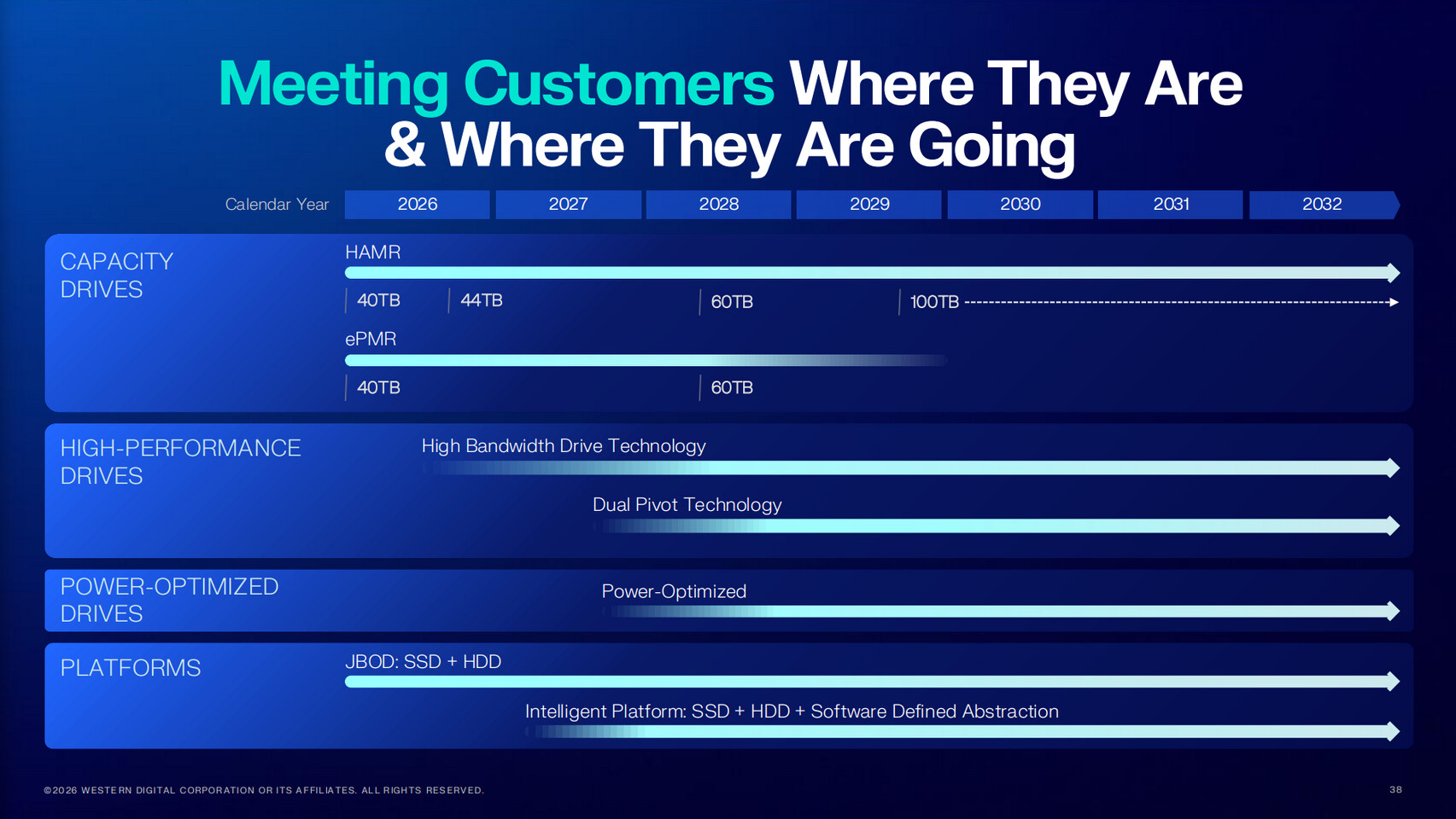 WD, tedy Western Digital, se však tváří, že nenechá segment pevných disků umřít a plánuje jej oživit jak po stránce rychlosti čtení a záznamu, tak po stránce kapacity. Přenosovou rychlost plánuje navýšit 8×, z čehož zdvojnásobení již demonstroval implementací funkce dual-pivot, tedy dvěma nezávislými rameny. Z laboratoří se však novinka na trh nedostane dříve než za rok.