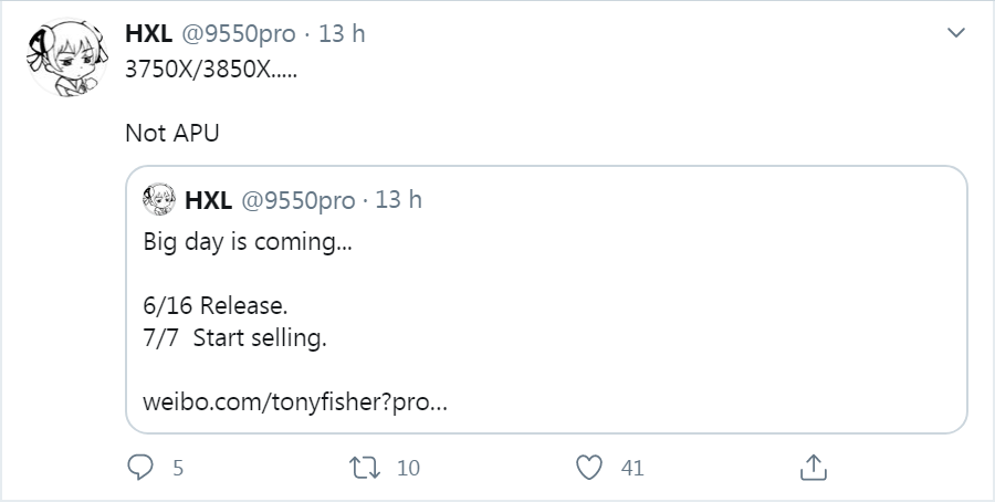 Uživatel HXL na Twitteru zmínil existenci dvou nových osmijádrových modelů architektury Zen 2, Ryzen 7 3750X a Ryzen 7 3850X. Několik teček naznačuje, že by mohly být i další.