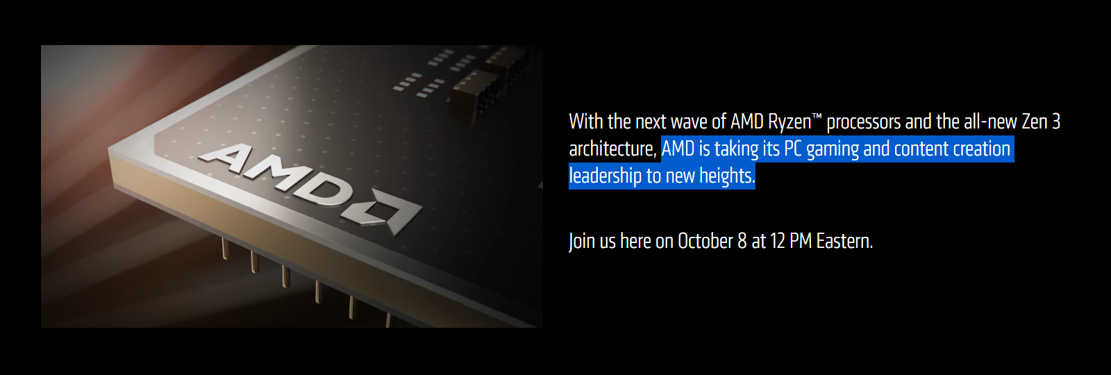 Nárůst herního výkonu opakovaně avizuje i AMD. Nějakou dobu již na jejím webu visí upoutávka s větou: „AMD is taking its PC gaming and content creation leadership to new heights“. Nyní přibyla další a ještě jednoznačnější indicie, když společnost nazvala akci, na níž Zen 3 / Ryzen 5000 představí: „Where Gaming Begins | AMD Ryzen™ Desktop Processors“.