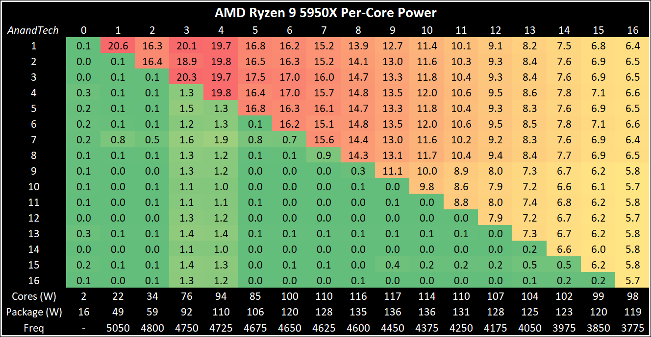 Spotřeba procesorového jádra v závislosti na počtu vytížených jader (Ryzen 9 5950X, podle Anandtech)
