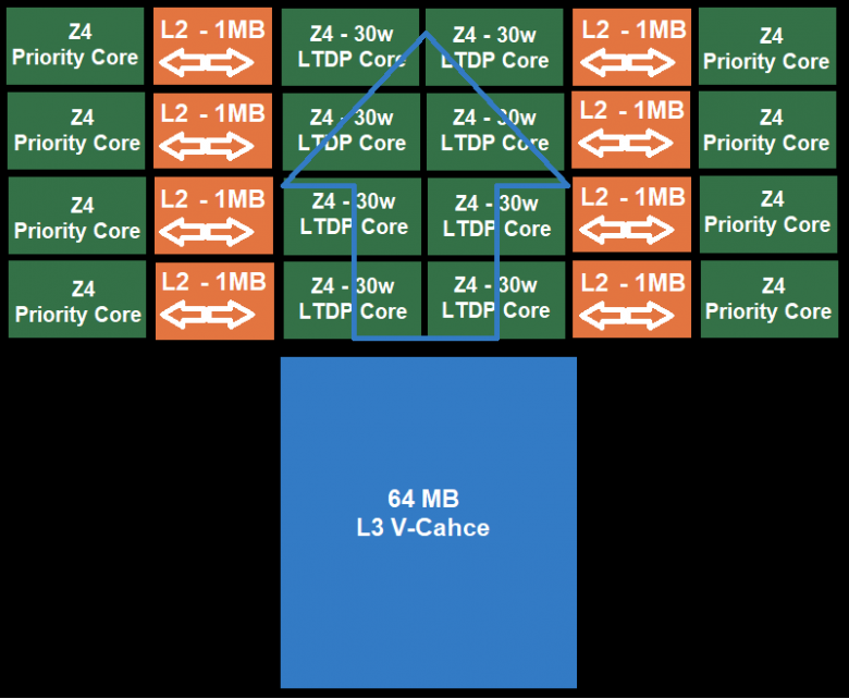 Pokud toto schéma vůbec zobrazuje reálný produkt (což je samozřejmě možné a budeme předpokládat, že ano - překlep „V-Cahce“ opomeňme), pak ale těžko zobrazuje desktopový Raphael. Co vlastně na snímku vidíme: Jde o čiplet, který nese celkem 16 jader Zen 4. Čipletu chybí L3 cache, obsahuje pouze L2 cache. L3 cache je navrstvena na osmici centrálních jader. Aby bylo odvodu tepla učiněno zadost, jsou procesorová jádra využívána následovně: Při zátěži nižšího počtu jader (kdy tato jádra běží na vysokém boostu a každé generuje vyšší množství odpadního tepla) jsou využívána jádra při okrajích čipu, která nejsou překryta cache. Teprve v okamžiku, kdy je osm krajových jader vyčerpáno, jsou využívána i středová jádra.
