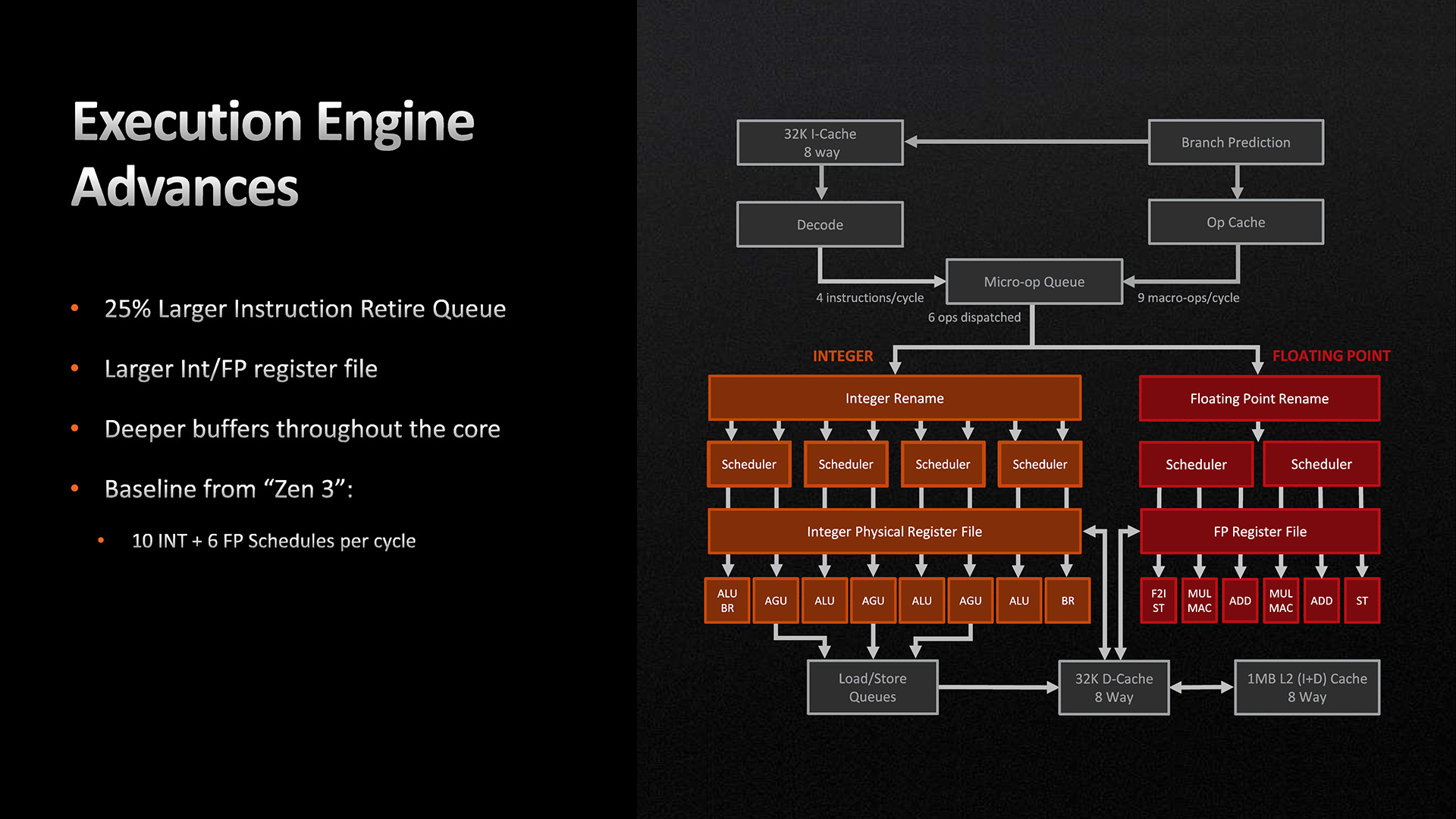 Cílem zvýšení počtu INT schedulerů na šest je jistě vyšší efektivita při celočíselných operacích, ale nemusí jít jen o výpočty jako takové. Změna totiž může mít pozitivní dopad i na paměťově náročné operace. Výpočet adresy se u současných architektur provádí v INT pipeline (přes AGU – Address Generation Unit), protože adresy jsou celé hodnoty a pracují s celočíselnou aritmetikou. Instrukce typu LOAD/STORE se v mikro-operacích rozkládají na výpočet adresy (INT/AGU cesta), samotný load/store do L1/L2/L3 cache a případný zápis výsledku. Pokud je INT pipeline vytížená, může se stát úzkým hrdlem a může zbrzdit i část pipeline potřebnou pro paměťové operace. V takové situaci popsaná změna pomůže k dalšímu zefektivnění paměťového subsystému. Že ji AMD zařadila právě na Zen 6, který řeší právě různá úzká hrdla paměťového subsystému (jinými slovy, v důsledku odstranění řady úzkých hrdel by INT pipeline mohla být častěji limitujícím prvkem), tak nevypadá na pouhou náhodu, ale jako další prvek z poměrně komplexního řešení.