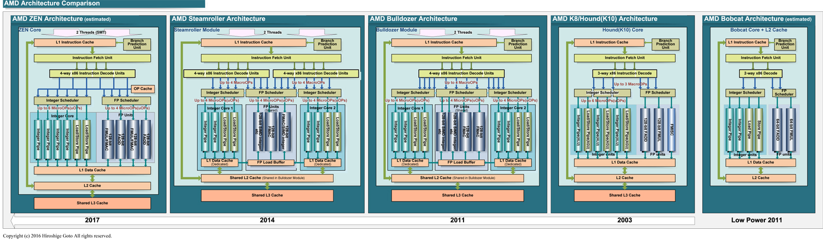 Následují dvě schémata, která na základě ISSCC prezentace připravil analytik Hiroshige Goto. První (nad textem) je diagramem jednoho jádra Zen. Níže pak Goto srovnává jádro Zen s jádry Steamroller, Bulldozer, K8 a Bobcat.