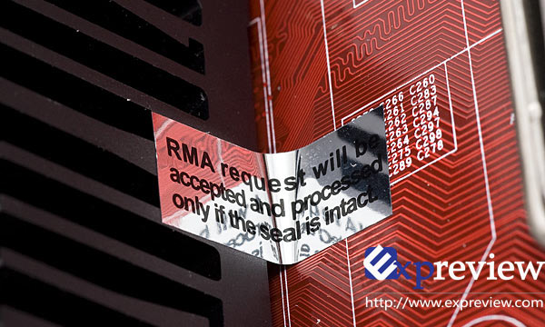 DFI Infinity P35-T2RL: Detail bezpečnostního štítku na chladiči